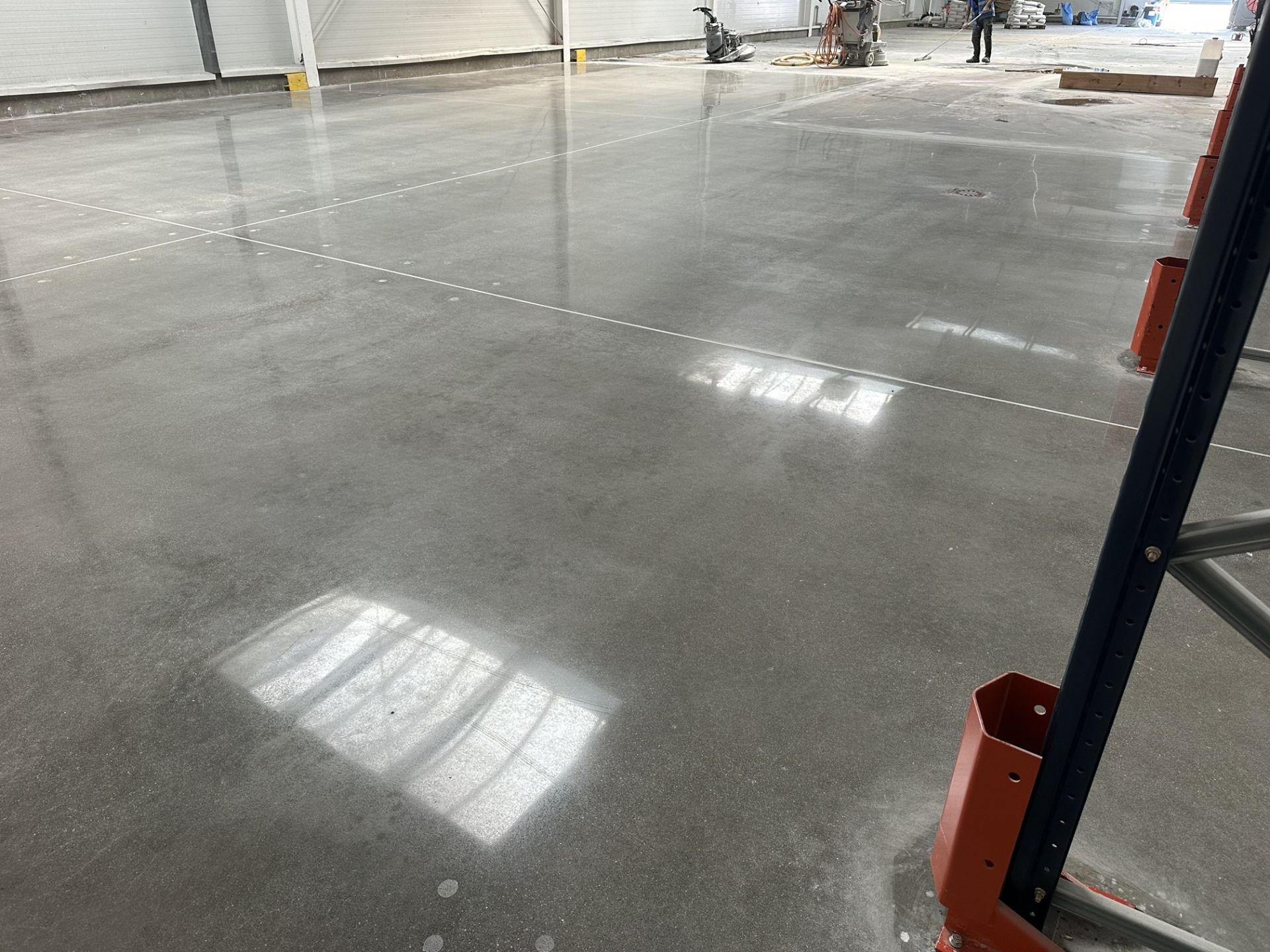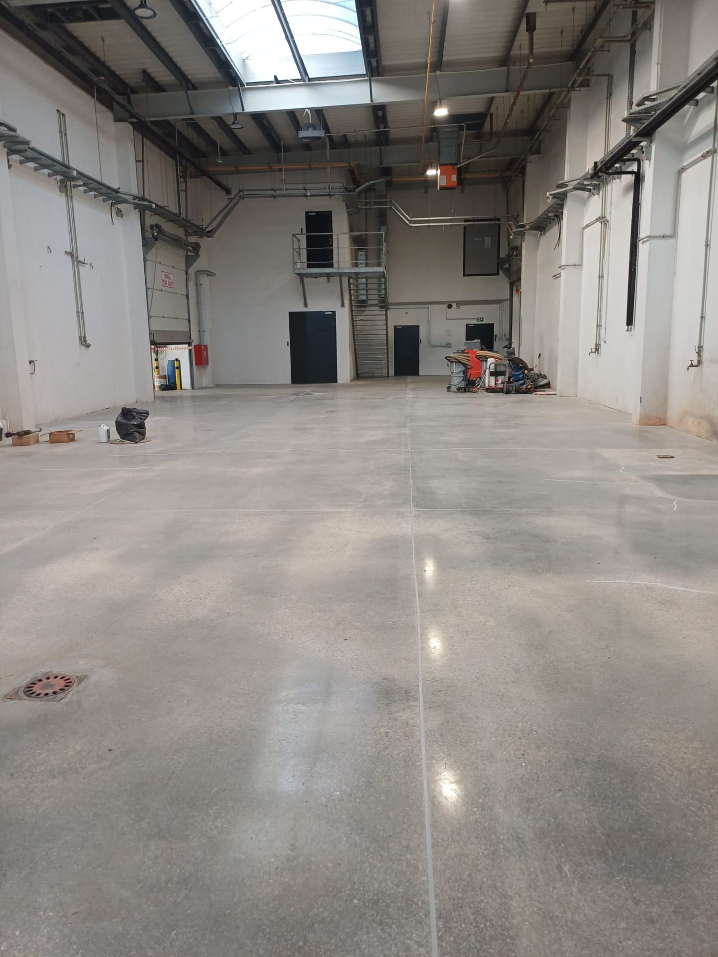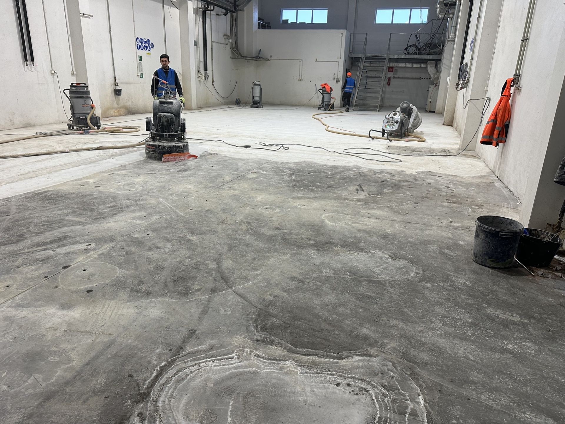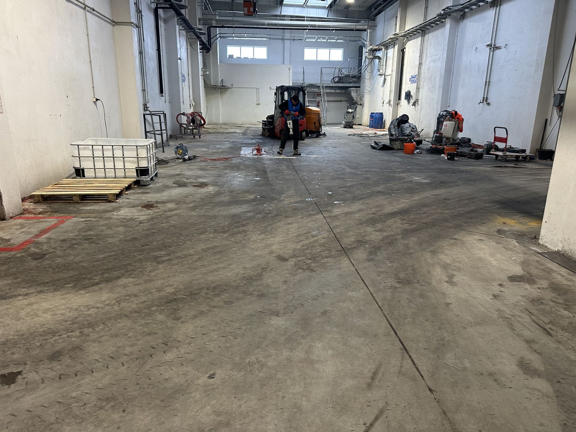 W pierwszym etapie wykonaliśmy stabilizację płyt w systemie iniekcji ciśnieniowej. Dzięki temu posadzka odzyskała stabilność, co znacząco ograniczy zużycie wózków oraz poprawi komfort pracy użytkowników. Następnie przeprowadziliśmy szlifowanie, wymianę dylatacji oraz polerowanie w systemie NOMEA FLOORING.